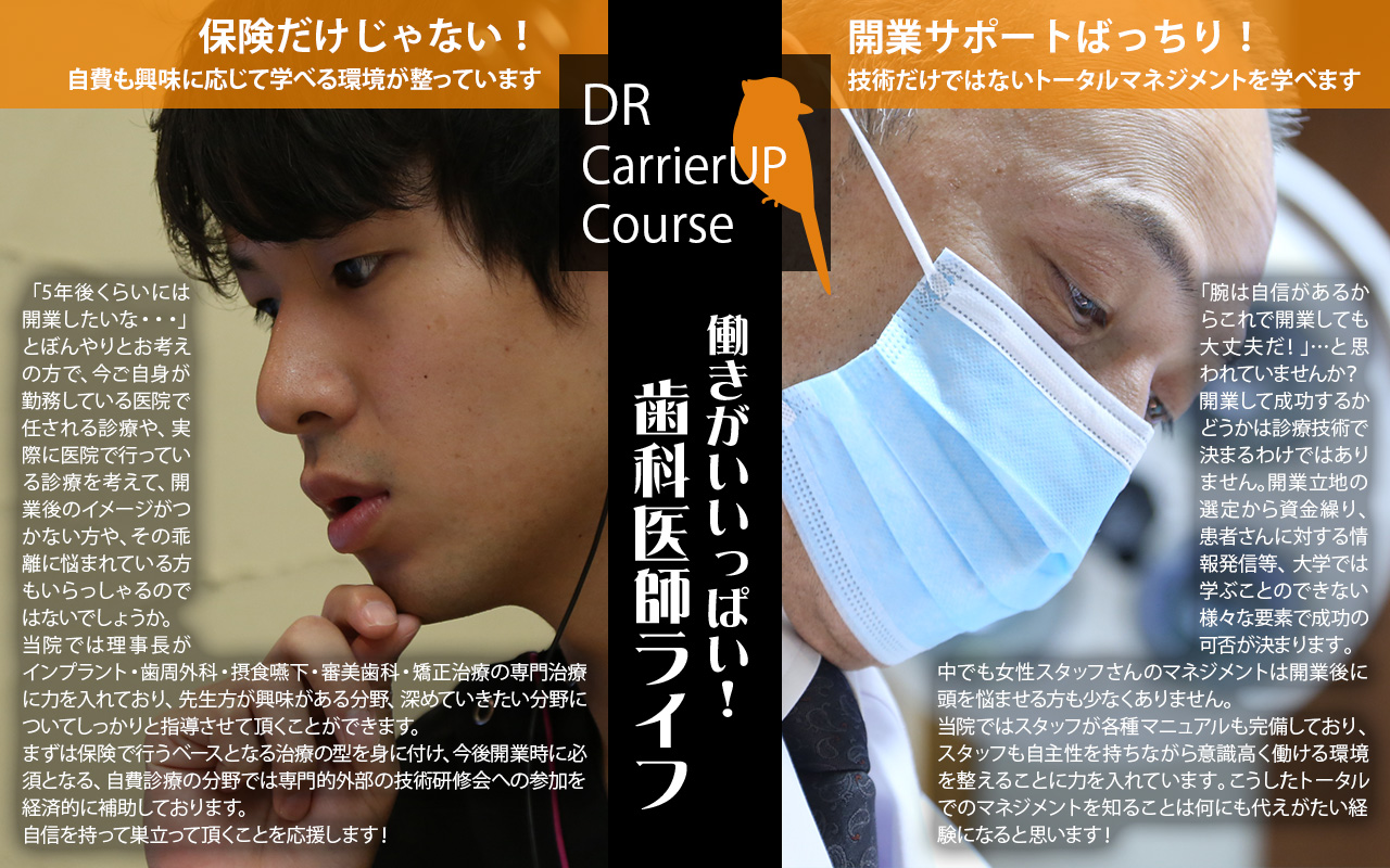 根治が得意、形成が得意、抜歯が得意・・・など現在のスキルをベースにさらに技術を磨きたい方もぜひご相談下さい。
